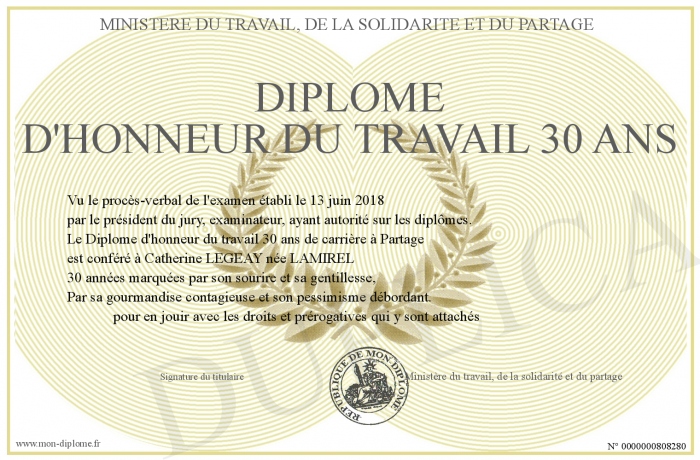 Envoyez par email votre Diplôme d'honneur du travail 30 ans personalisé