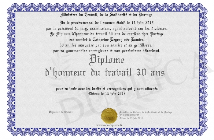 Envoyez par email votre Diplôme d'honneur du travail 30 ans personalisé