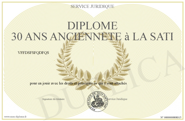 Envoyez par email votre Diplôme 30 ans ancienneté à la SATI personalisé