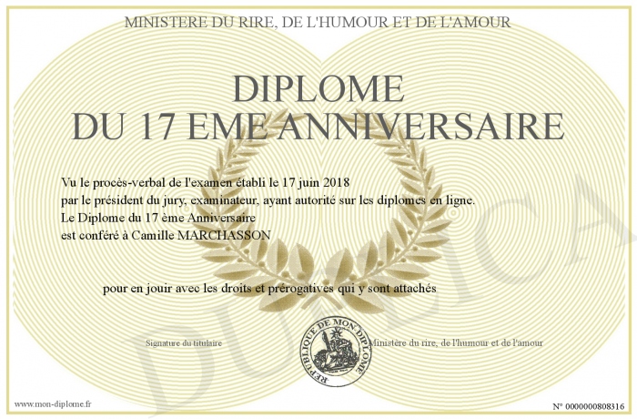 Envoyez par email votre Diplome du 17 ème Anniversaire personalisé