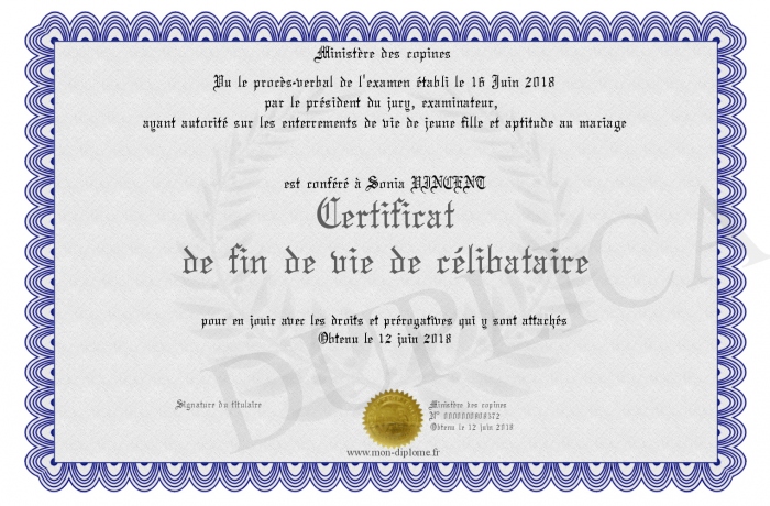 Envoyez par email votre Certificat de fin de vie de célibataire personalisé