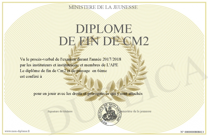 Envoyez par email votre Diplôme de fin de CM2 personalisé