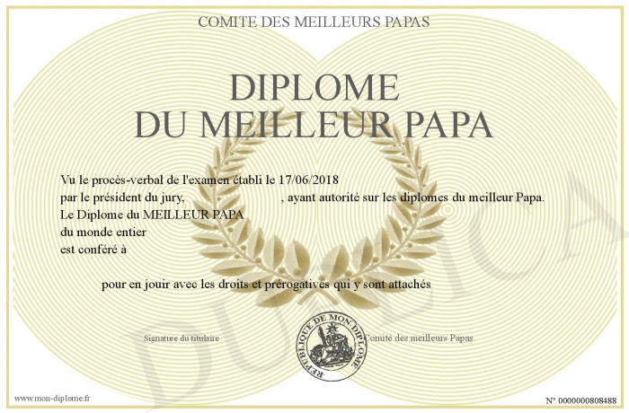 Envoyez par email votre Diplôme du MEILLEUR PAPA personalisé