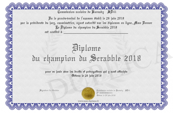 Envoyez par email votre Diplôme du champion du Scrabble 2018 personalisé