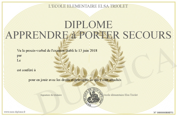 Envoyez par email votre Diplôme Apprendre à porter secours personalisé