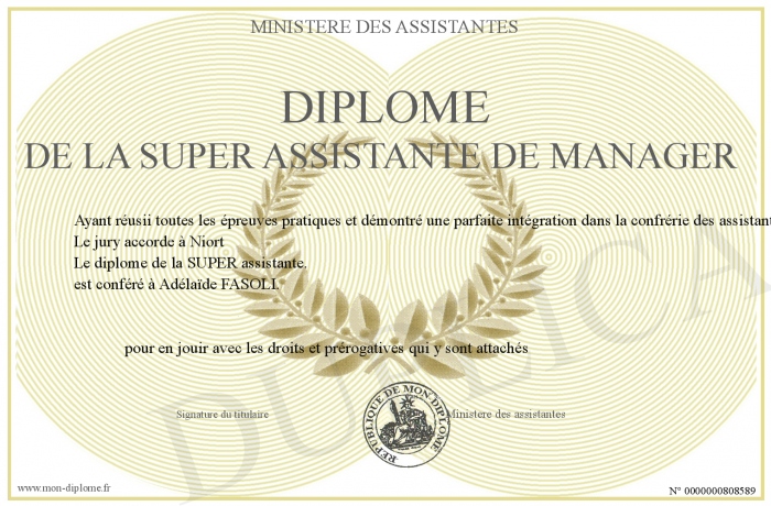 Envoyez par email votre Diplôme de la super assistante de Manager personalisé