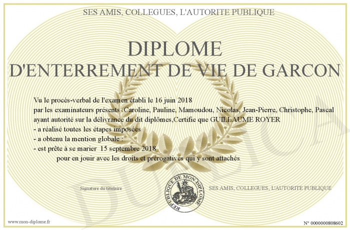 Envoyez par email votre Diplome d'Enterrement de vie de garcon personalisé