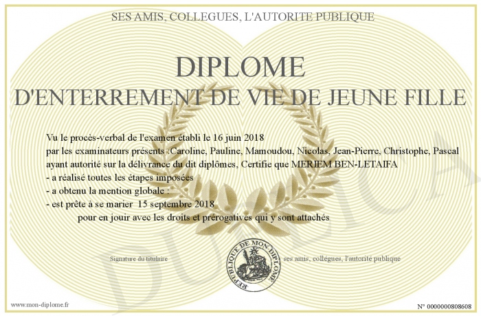 Envoyez par email votre Diplome d'Enterrement de vie de jeune fille personalisé