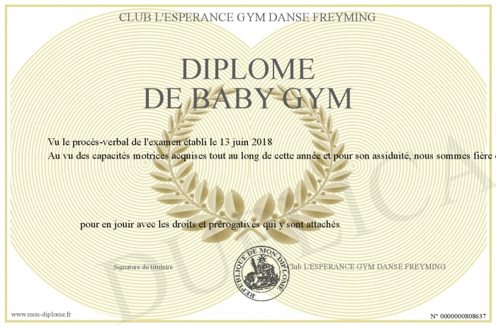 Envoyez par email votre Diplôme de Baby Gym personalisé