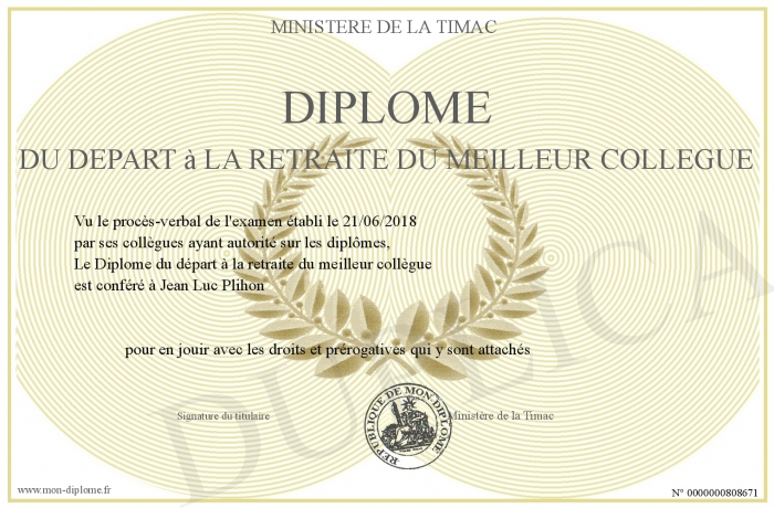 Envoyez par email votre Diplôme du départ à la retraite du meilleur collègue personalisé