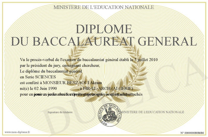 Envoyez par email votre DIPLOME DU BACCALAUREAT GENERAL personalisé