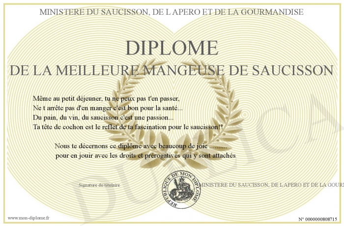 Envoyez par email votre Diplôme de la meilleure mangeuse de saucisson personalisé