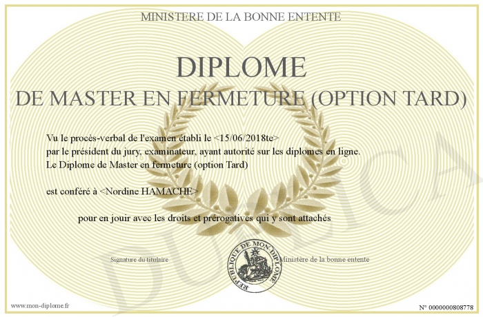 Envoyez par email votre Diplôme de Master en fermeture (option Tard) personalisé