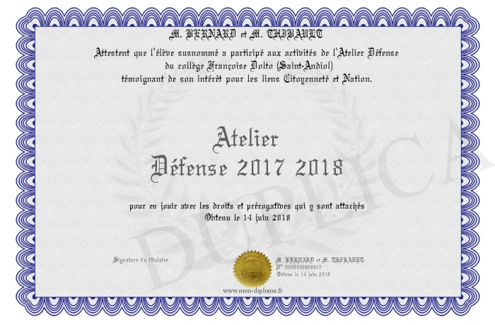 Envoyez par email votre Atelier Défense 2017 2018 personalisé