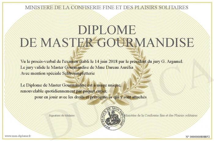 Envoyez par email votre Diplôme de Master Gourmandise personalisé