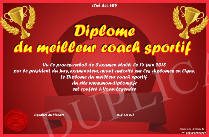 Envoyez par email votre Diplôme du meilleur coach sportif personalisé