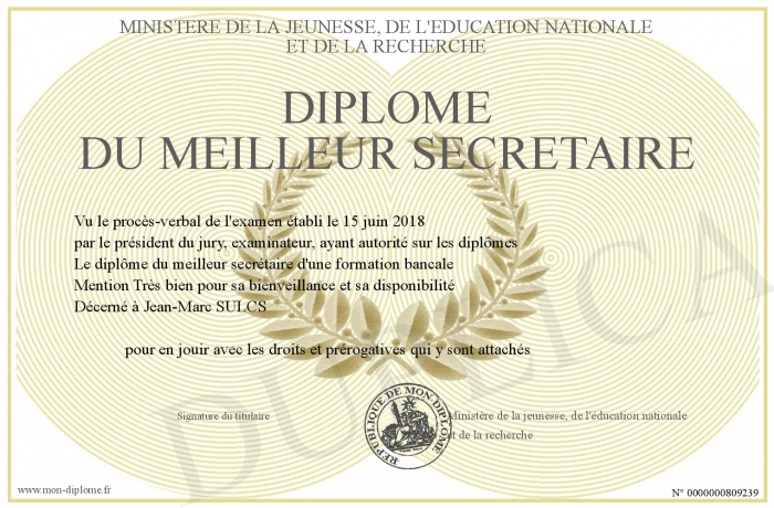 Envoyez par email votre Diplôme du meilleur secrétaire personalisé
