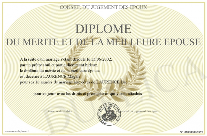 Envoyez par email votre diplôme du mérite et de la meilleure épouse personalisé