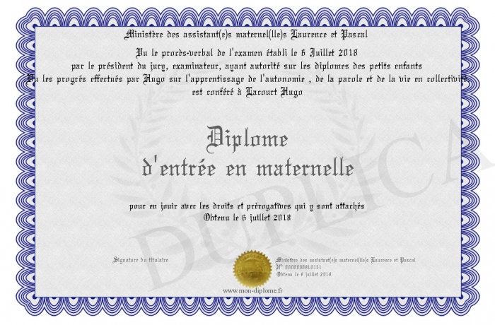 Envoyez par email votre Diplôme d'entrée en maternelle personalisé