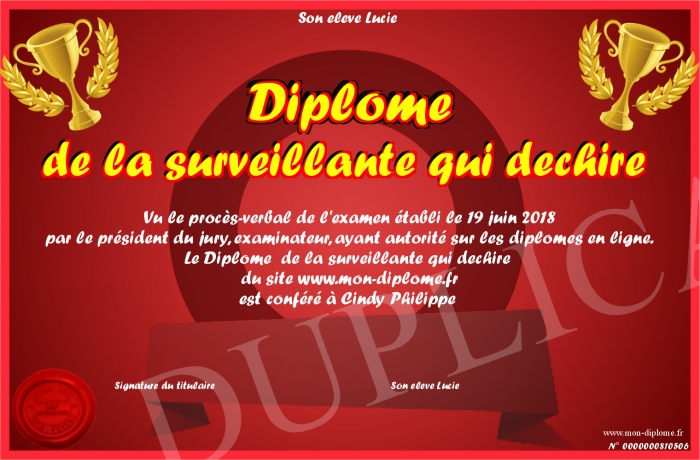 Envoyez par email votre Diplôme de la surveillante qui dechire personalisé