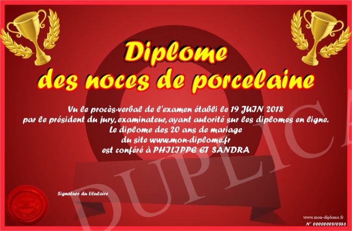 Envoyez par email votre Diplôme des noces de porcelaine personalisé