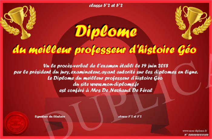 Envoyez par email votre Diplôme du meilleur professeur d'histoire Géo personalisé