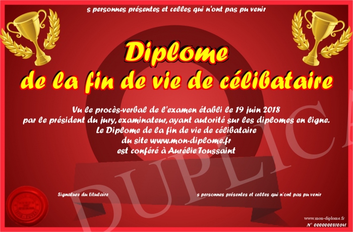 Envoyez par email votre Diplôme de la fin de vie de célibataire personalisé