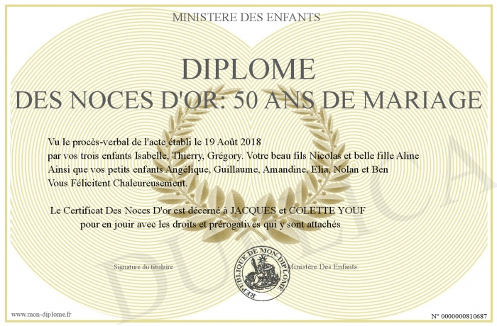 Envoyez par email votre Diplôme des Noces D'or: 50 ans de Mariage personalisé