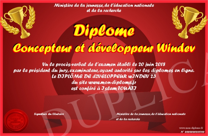 Envoyez par email votre Diplôme Concepteur et développeur Windev personalisé