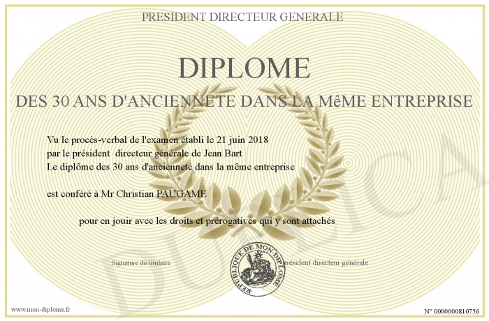 Envoyez par email votre Diplôme des 30 ans d'ancienneté dans la même entreprise personalisé