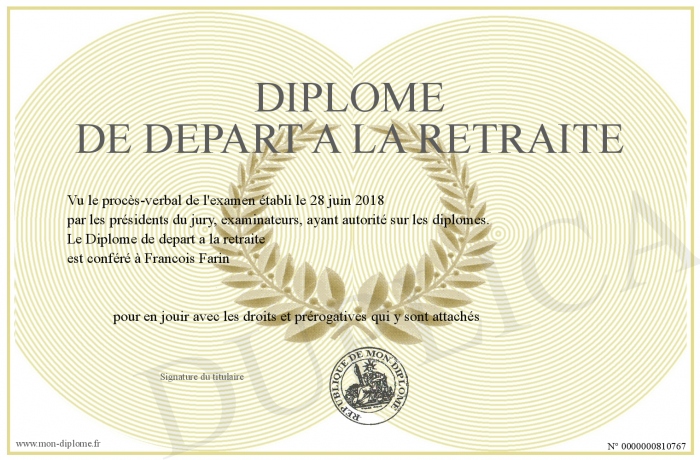 Envoyez par email votre Diplôme de depart a la retraite personalisé