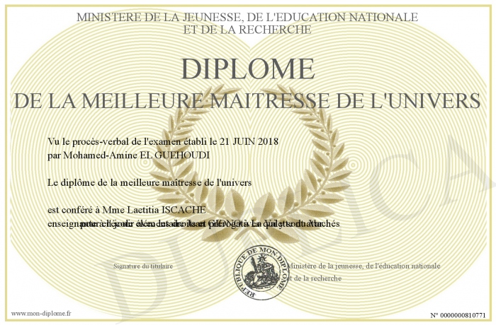 Envoyez par email votre DIPLOME DE LA MEILLEURE MAITRESSE DE L'UNIVERS personalisé