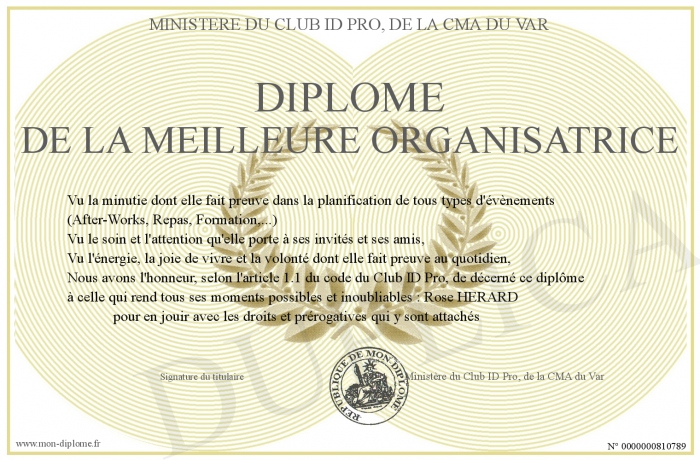 Envoyez par email votre Diplôme de la meilleure organisatrice personalisé