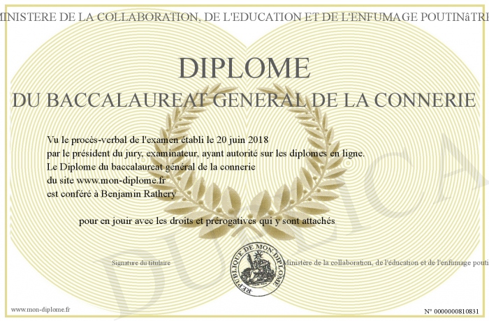 Envoyez par email votre Diplôme du baccalaureat général de la connerie personalisé