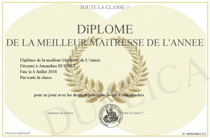 Envoyez par email votre Dîplome de la meilleur Maîtresse de l'année personalisé