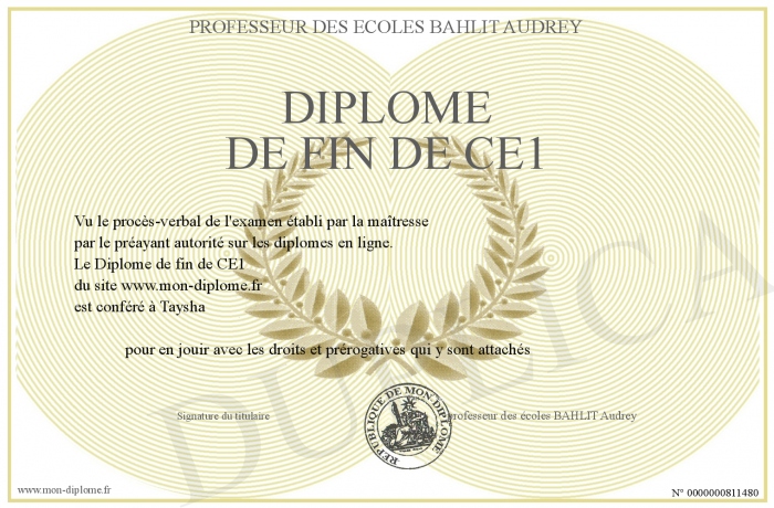 Envoyez par email votre Diplôme de fin de CE1 personalisé