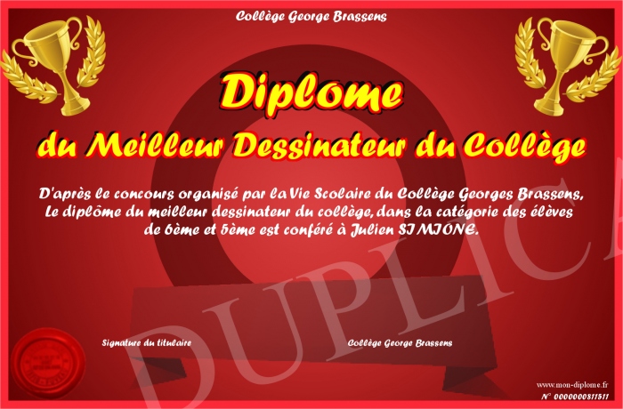 Envoyez par email votre Diplôme du Meilleur Dessinateur du Collège personalisé