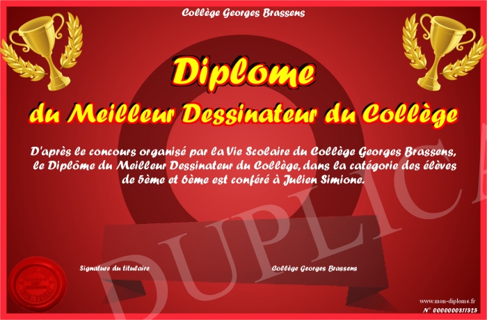 Envoyez par email votre Diplôme du Meilleur Dessinateur du Collège personalisé