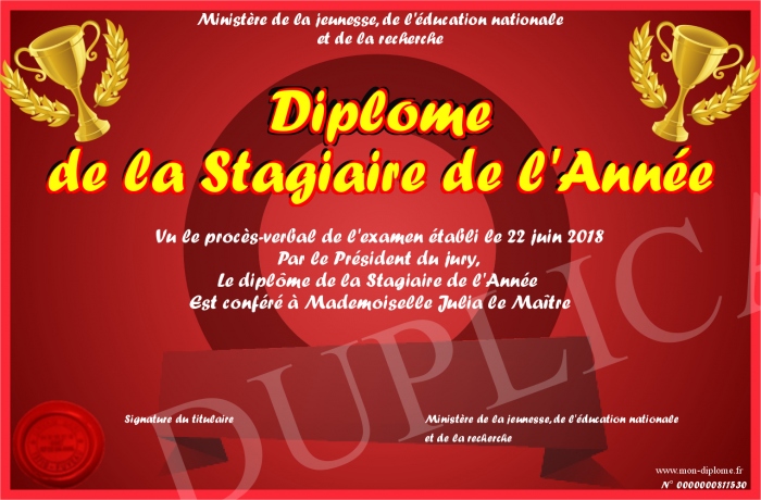 Envoyez par email votre Diplôme de la Stagiaire de l'Année personalisé