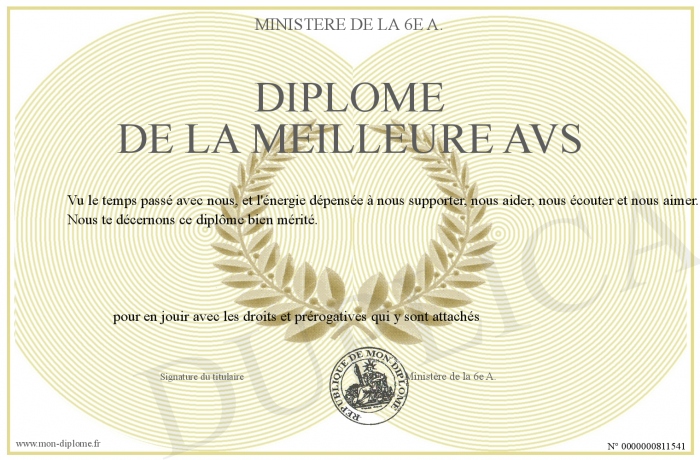 Envoyez par email votre Diplôme de la meilleure AVS personalisé