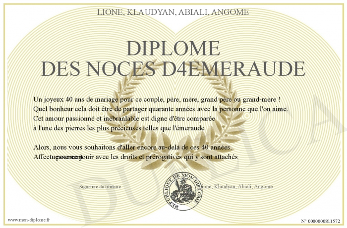 Envoyez par email votre Diplôme des noces d4EMERAUDE personalisé