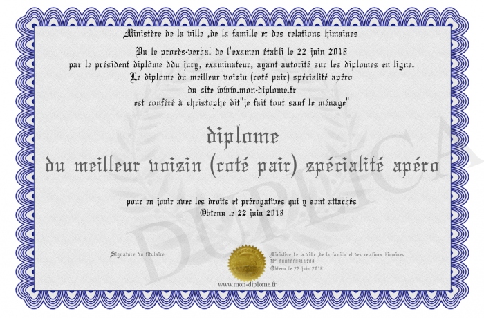 Envoyez par email votre diplome du meilleur voisin (coté pair) spécialité apéro personalisé