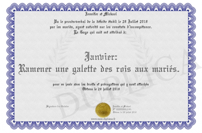 Envoyez par email votre Janvier: Ramener une galette des rois aux mariés. personalisé