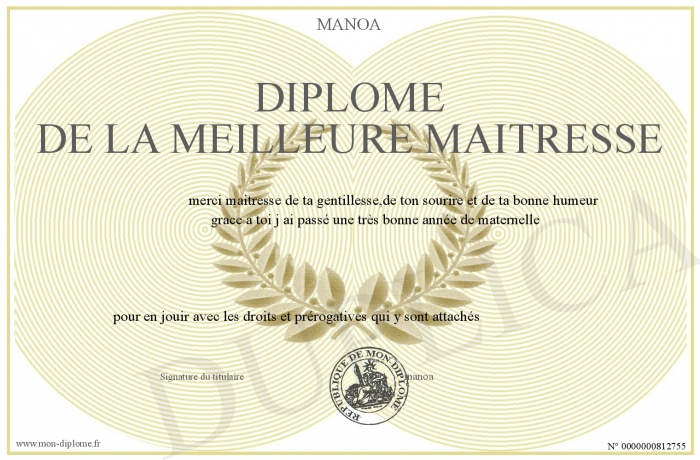 Envoyez par email votre Diplôme de la meilleure maitresse personalisé