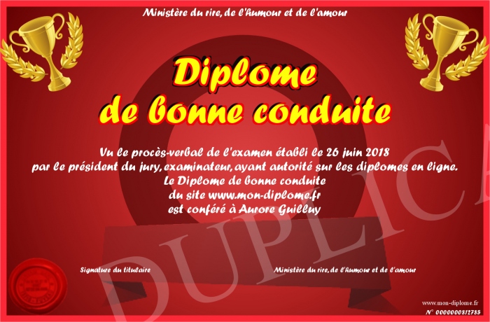 Envoyez par email votre Diplome de bonne conduite personalisé