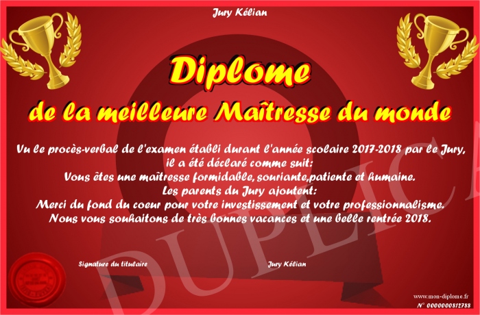 Envoyez par email votre Diplôme de la meilleure Maîtresse du monde personalisé