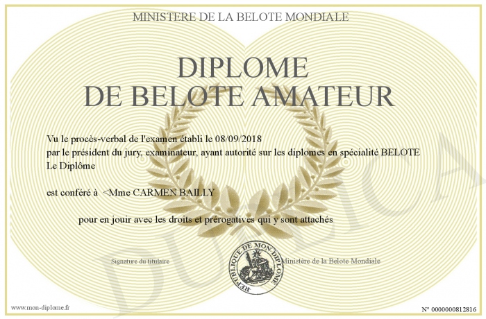 Envoyez par email votre Diplôme de BELOTE AMATEUR personalisé