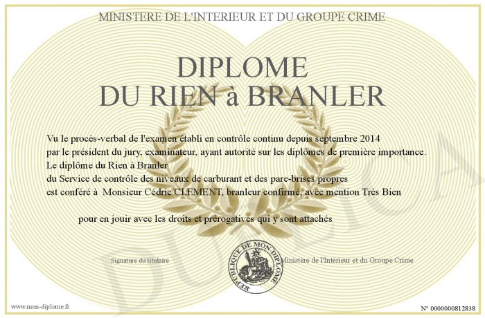Envoyez par email votre Diplôme du Rien à Branler personalisé