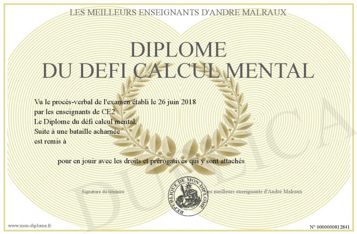 Envoyez par email votre Diplôme du défi calcul mental personalisé