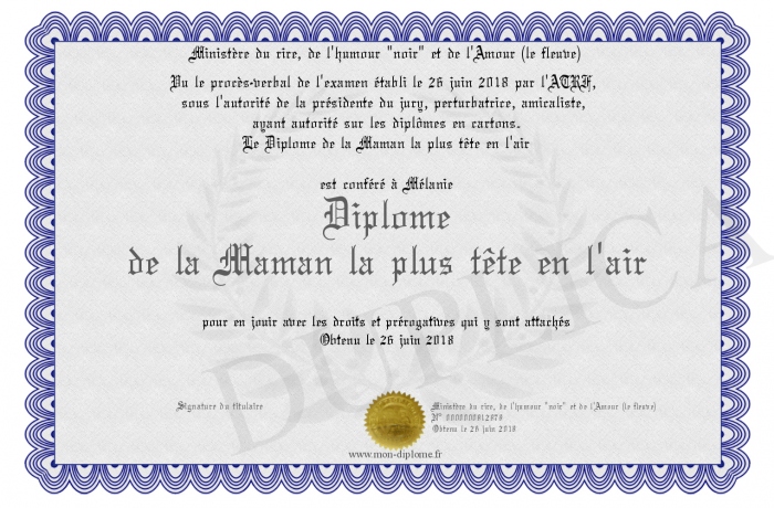 Envoyez par email votre Diplôme de la Maman la plus tête en l'air personalisé